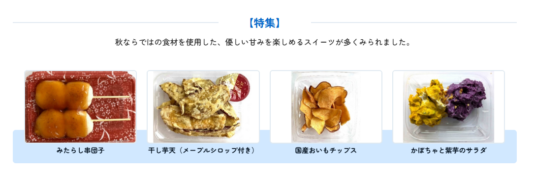 やっと過ごしやすい気候になり行楽日和の日が増えてきました。見た目も華やかなお惣菜が多く出ています。特集では秋らしいスイーツを取り上げています。 お惣菜をチラ見せ👀↓